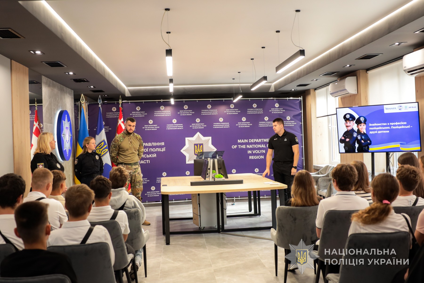 Школярі ознайомилися з роботою ситуаційного центру ГУНП - черговою частиною, кабінетом ситуаційного аналізу, операторами лінії 102, диспетчерами, а також з роботою певних ланок поліції, зокрема, криміналістів, вибухотехніків, кінологів. Також учні мали змогу поспілкуватися із бійцями стрілецького батальйону, батальйону «Захід», які виконували бойові завдання на передовій.