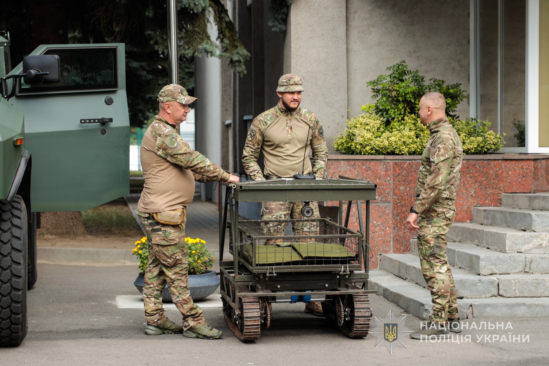 Бійці стрілецького батальйону ознайомили школярів із наземним роботизованим комплексом, який може доставляти їжу на позиції та забирати звідти поранених. Також на подвірʼї були представлені й броньовані автомобілі.