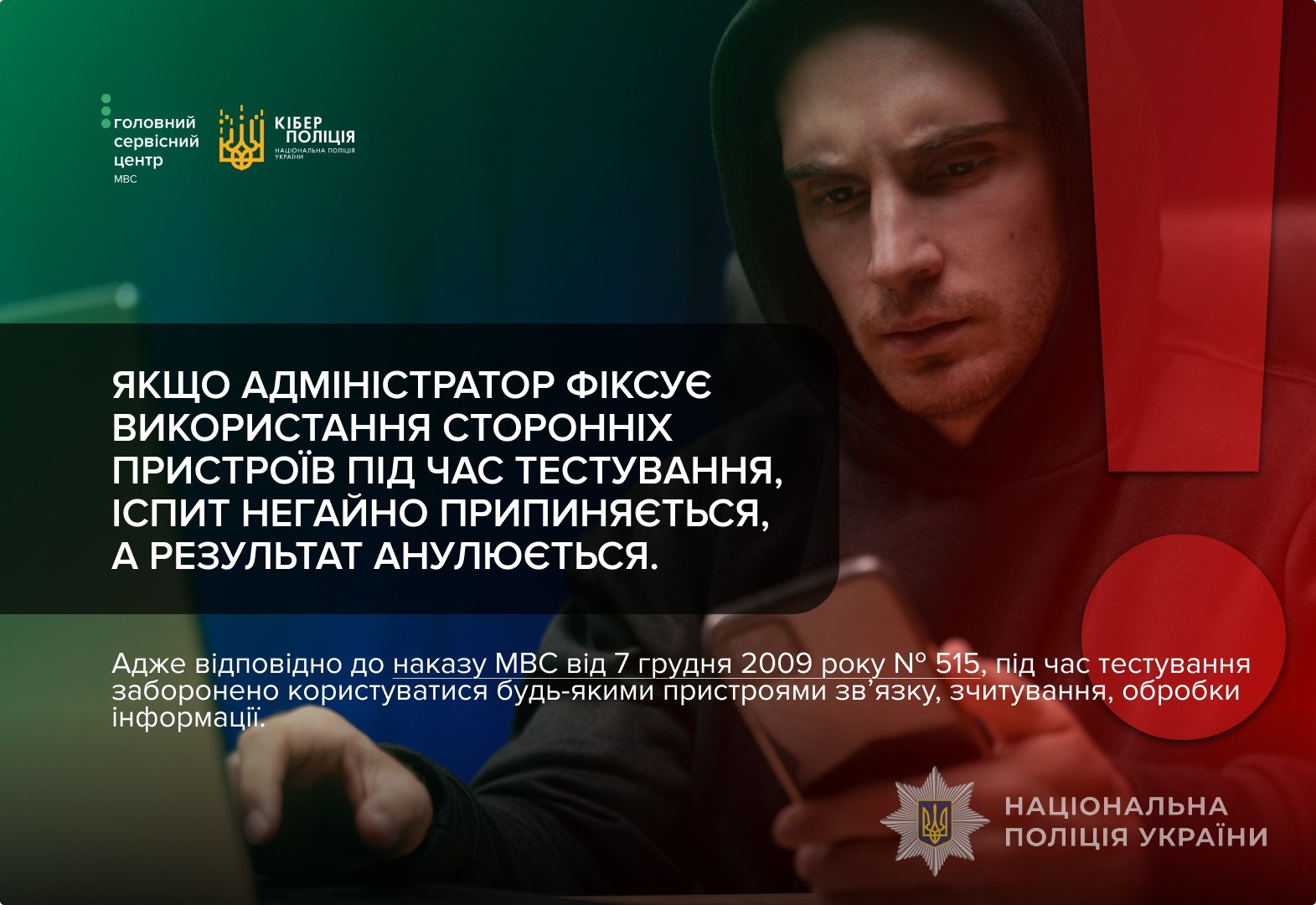 Якщо адміністратор фіксує використання сторонніх пристроїв під час тестування, іспит негайно припиняється, а результат анулюється. Адже відповідно до наказу МВС від 7 грудня 2009 року № 515, під час тестування заборонено користуватися будь-якими пристроями зв’язку, зчитування, обробки інформації.