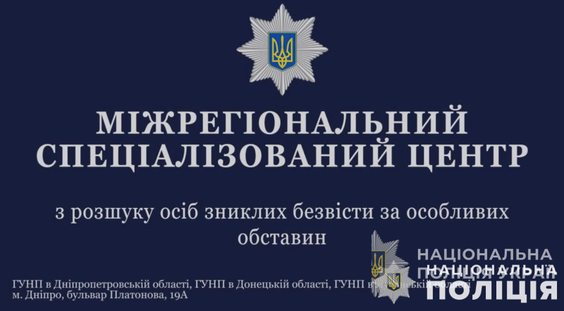 Міжрегіональний спеціалізований Центр з розшуку осіб, зниклих безвісти за особливих обставин розпочав свою роботу у Дніпрі 10 жовтня. Центр функціонує на єдиній локації та об’єднав в собі роботу поліцейських з трьох регіонів – Донецької, Луганської та Дніпропетровської областей. Це слідчі, працівники карного розшуку, криміналісти, вузькоспеціалізовані спеціалісти з розшуку безвісти зниклих осіб.