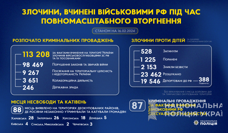 Злочини, вчинені військовими рф під час повномасштабного вторгнення в Україну (станом на 16.02.2024)