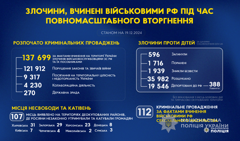 З початку повномасштабного вторгнення росії в Україну слідчі Національної поліції України розпочали 137 699 кримінальних проваджень за фактами вчинення на території України злочинів військовослужбовцями збройних сил російської федерації та їхніми пособниками.